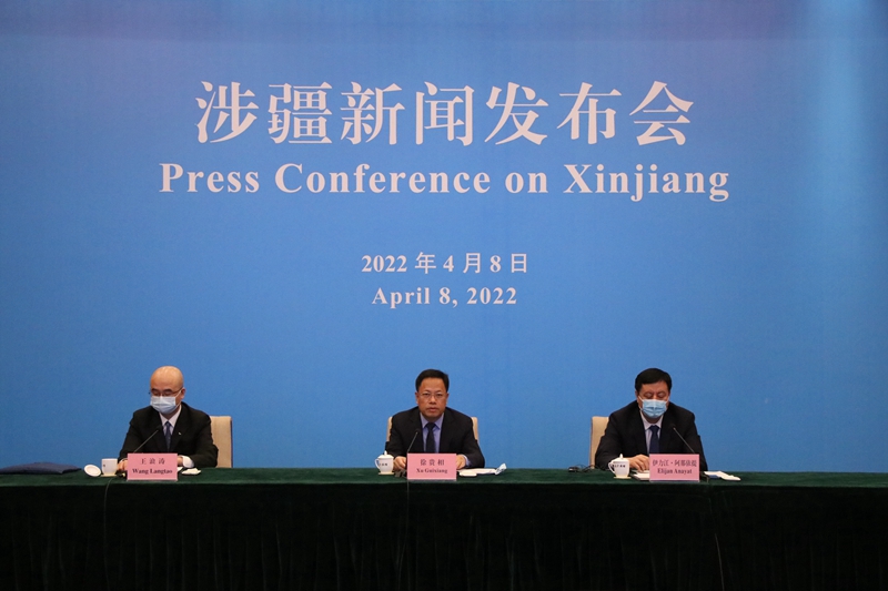 徐貴相:各位記者朋友,大家好,歡迎出席新疆維吾爾自治區(qū)涉疆新聞發(fā)布會,我是新疆維吾爾自治區(qū)人民政府新聞發(fā)言人徐貴相。首先,我介紹參加本場發(fā)布會的人員,他們分別是:新疆維吾爾自治區(qū)人民政府新聞發(fā)言人伊力江·阿那依提先生、新疆維吾爾自治區(qū)高級人民法院副院長王浪濤先生。同時,還有7名專家學者、企業(yè)負責人、轉移就業(yè)員工等通過視頻連線方式參會,他們分別是:浙江師范大學邊疆研究院教授王江、新疆師范大學副教授嚴學勤、新疆伊犁卓萬服飾制造公司人事主管艾麗達·吐爾阿合買提、新疆喀什地區(qū)麥蓋提縣赴湖北武漢務工人員阿依努爾·艾買爾、新疆阿樂庫得林牧科技有限公司董事長阿不都熱依木·力提普、新疆溫宿縣古勒阿瓦提鄉(xiāng)英艾日克村棉農馬木提·達吾提、新疆中泰海鴻紡織印染有限公司員工米熱古麗·玉山。