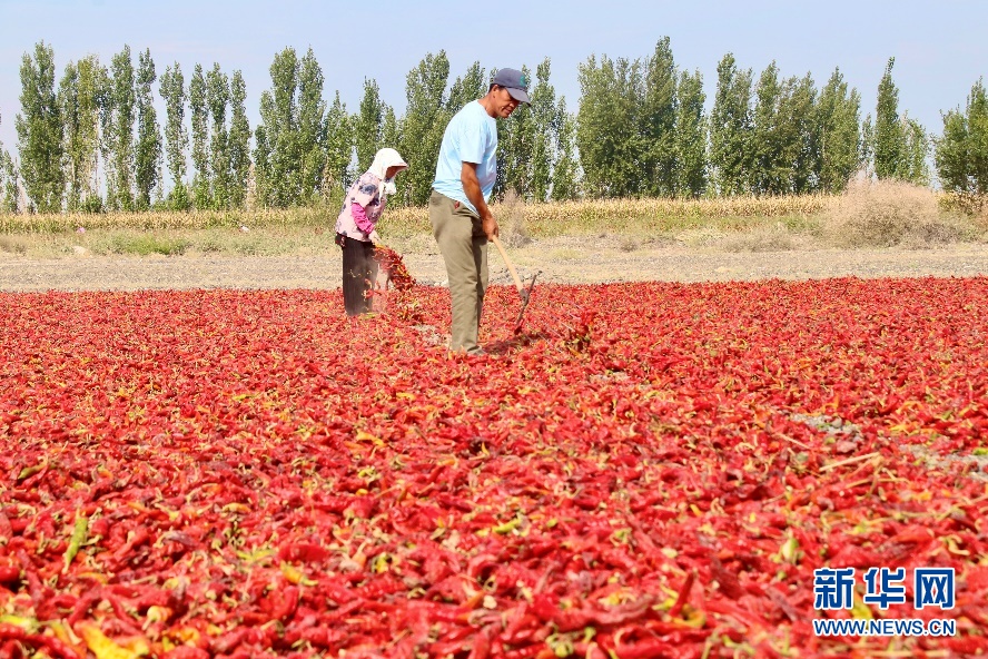 沙灣市安集海鎮(zhèn)農(nóng)民正在晾曬辣椒。新華網(wǎng)發(fā) 曾照美攝