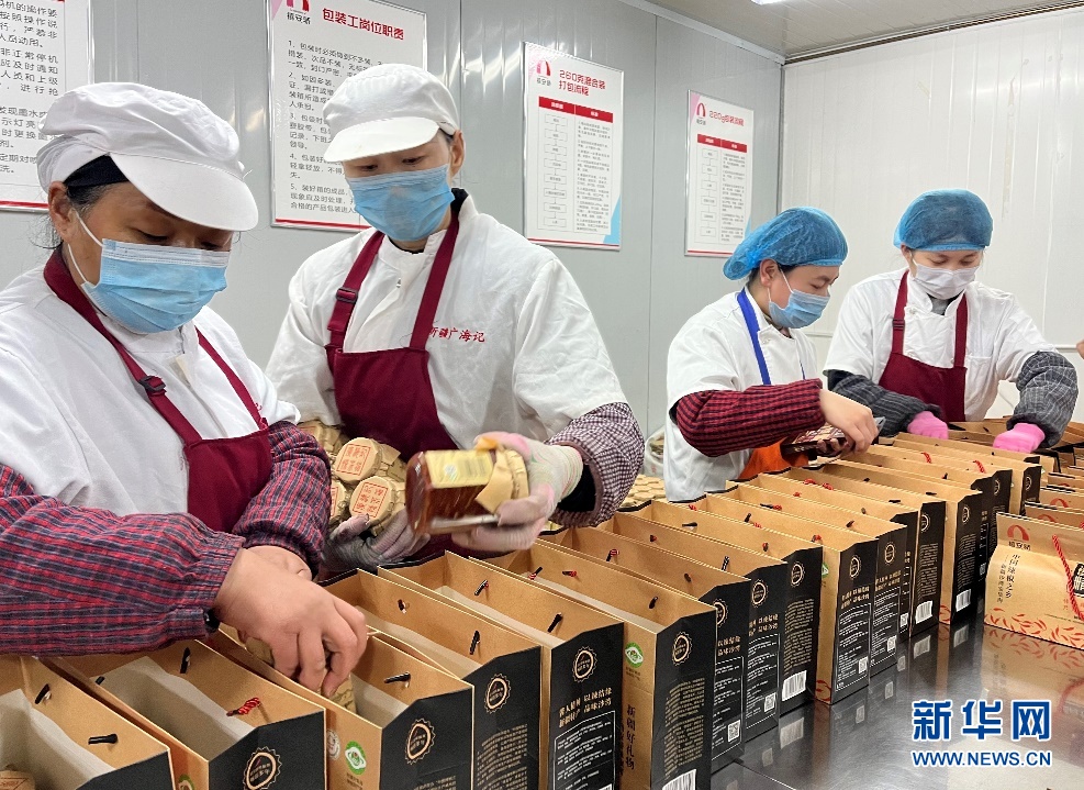 新疆廣海記農(nóng)業(yè)科技發(fā)展有限公司工人正在包裝辣椒醬。 新華網(wǎng)發(fā) 張婧攝