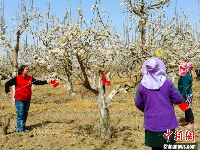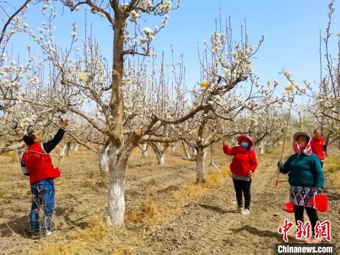 14日,新疆庫(kù)爾勒市果農(nóng)們穿梭其中,搶抓晴好天氣給梨花授粉,為提高果實(shí)品質(zhì)、豐產(chǎn)增收打好基礎(chǔ)。