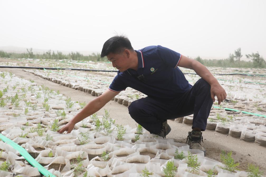 周小珂在老兵治沙隊(duì)文冠果育苗基地打理文冠果幼苗(攝于2025年6月13日)。新華社記者劉詩(shī)平 攝
