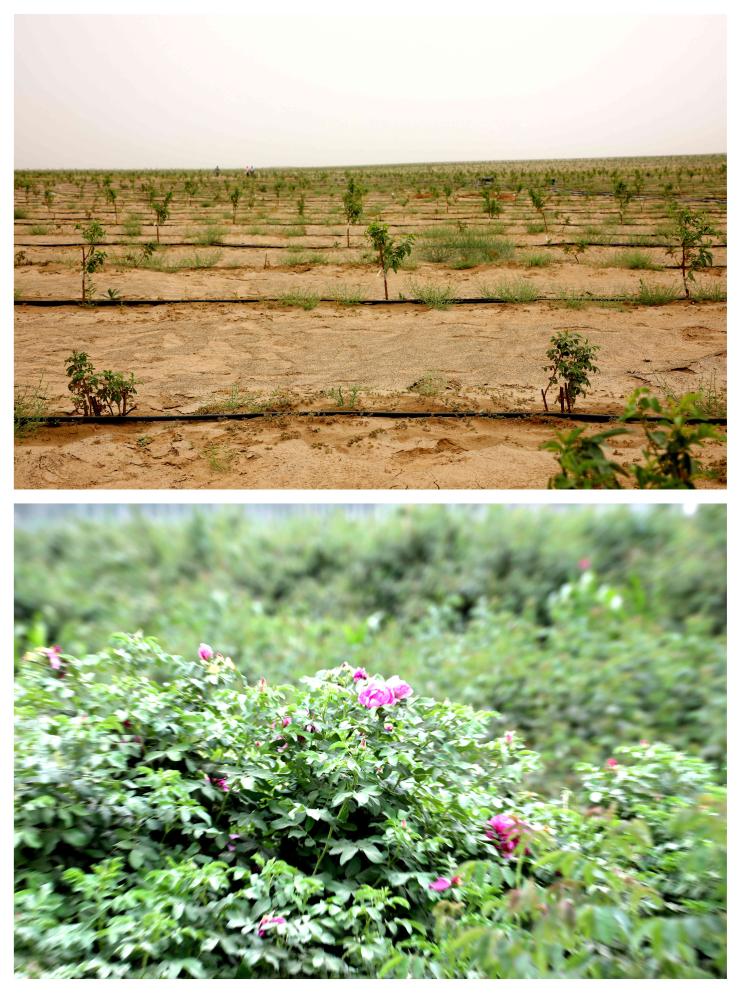 上圖為七仙女防沙治沙標(biāo)桿項(xiàng)目區(qū)套種的玫瑰和桃樹(shù),下圖為七仙女村的玫瑰(攝于2025年6月16日)。新華社記者劉詩(shī)平 攝
