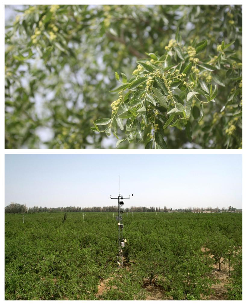 若羌縣萬(wàn)畝紅棗示范基地的棗林,圖中間為小氣候環(huán)境監(jiān)測(cè)站(攝于2025年6月12日)。新華社記者劉詩(shī)平 攝