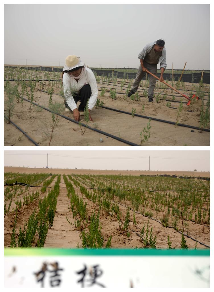 民豐縣后河壩沙漠阻擊區(qū)試驗(yàn)田里,村民正在護(hù)理套種的桔梗(攝于2025年6月12日)。新華社記者劉詩(shī)平 攝