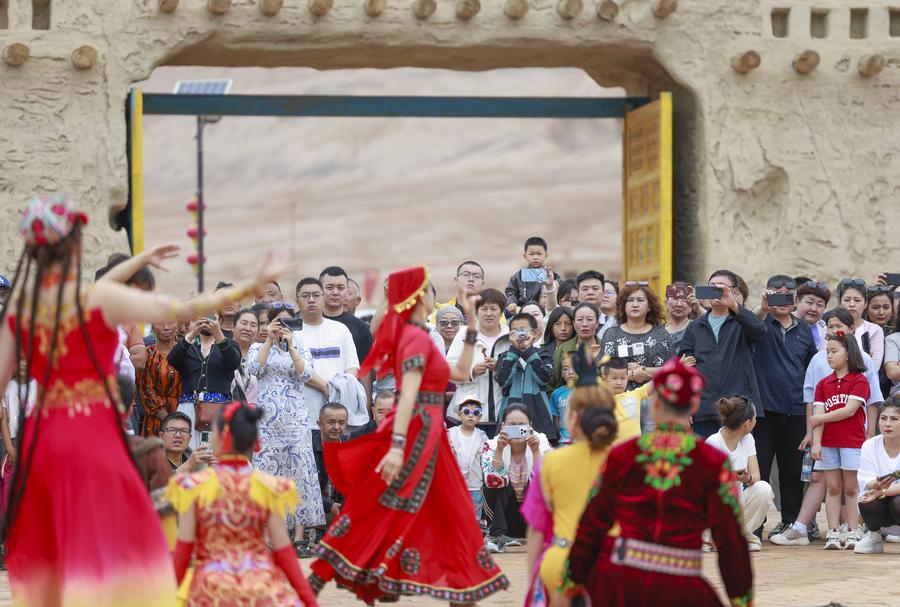 Tourists watch a folk art performance at a scenic area in Turpan, northwest China's Xinjiang Uygur Autonomous Region, May 4, 2025. (Xinhua/Wang Fei)
