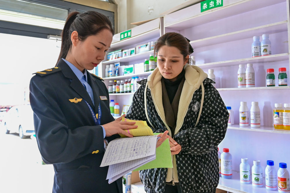 2024年3月21日,新疆阿克蘇市農(nóng)業(yè)綜合行政執(zhí)法大隊的執(zhí)法人員在阿克蘇市農(nóng)資市場查看農(nóng)資經(jīng)銷部的銷售臺賬。