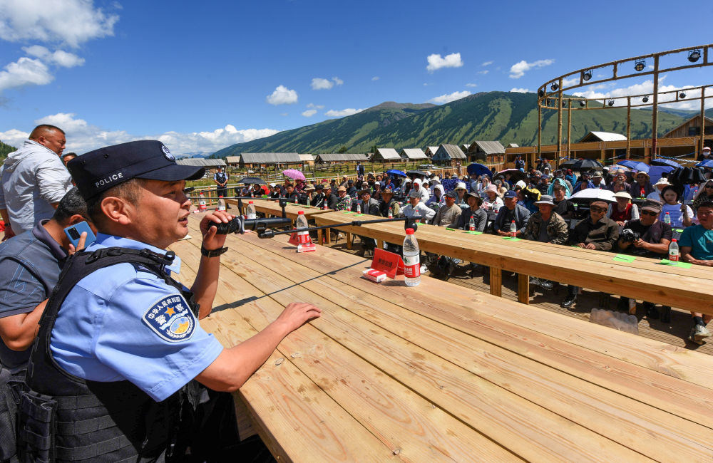 2024年7月22日,在新疆阿勒泰地區(qū)布爾津縣禾木哈納斯蒙古族鄉(xiāng)哈納斯村,喀納斯邊境派出所民警在村民大會上給村民宣講邊境法律法規(guī)。近年來,喀納斯邊境派出所通過“警村企黨支部聯(lián)合工作站”模式,聯(lián)合當(dāng)?shù)厝罕?、景區(qū)一起解決游客難題,大大提升了警務(wù)效率,逐步形成了“景中警 貼心人”的旅游警務(wù)品牌。