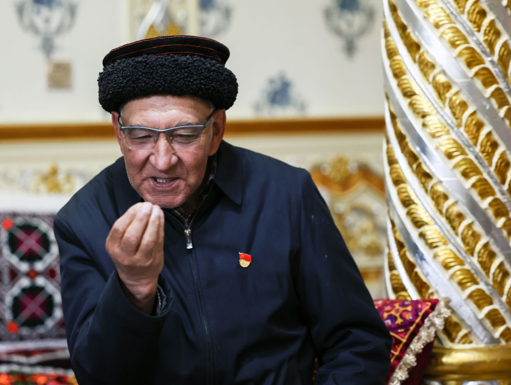 2023年9月4日,“時代楷模”拉齊尼·巴依卡的父親巴依卡老人在新疆塔什庫爾干塔吉克自治縣的家中接受采訪。生活于帕米爾高原上的塔吉克族兒女,素來心中懷有“家是塔縣,國是中國,放牧守邊是職責(zé)”的愛國守邊精神。巴依卡老人一家三代70年接續(xù)守邊護邊,愛國奉獻的壯舉感動了無數(shù)國人。“邊境線是中國的邊境線,紅其拉甫是中國56個民族的紅其拉甫,我們的56個民族就要像石榴籽一樣緊緊抱在一起。”巴依卡老人說。