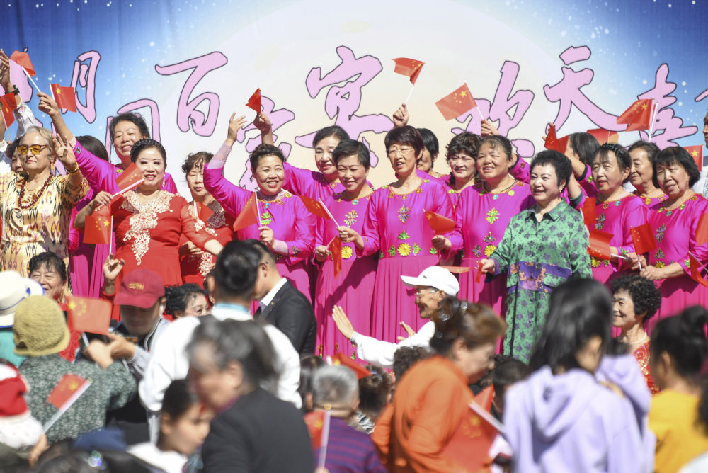 2024年9月15日,新疆烏魯木齊市天山區(qū)固原巷社區(qū)舉辦“中秋月圓百家宴 歡天喜地迎國慶”活動,人們載歌載舞,共享節(jié)日歡樂。