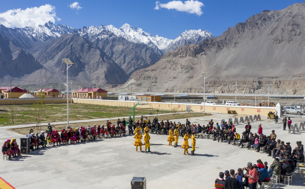 2020年6月6日,新疆塔什庫爾干塔吉克自治縣文工團演員在達布達爾鄉(xiāng)的一個山村為村民表演舞蹈節(jié)目(無人機照片)。塔縣文工團成立于1956年,現(xiàn)有工作人員100余人,是活躍于新疆帕米爾高原上的“文藝輕騎兵”。在自然環(huán)境嚴(yán)酷的高原,塔縣文工團演員們常年堅持送文化進山村、到牧場,宣講惠民政策,用文藝演出豐富村民的精神文化生活。