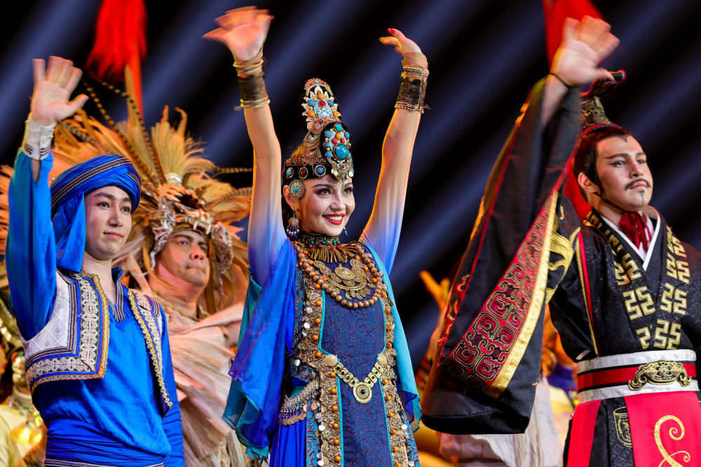 2022年4月22日,在新疆藝術(shù)劇院木卡姆藝術(shù)團劇場,舞蹈演員馬依熱·艾買提江(中)在舞劇《張騫》演出后向觀眾致謝。馬依熱來自烏魯木齊,11歲時前往北京跟隨專業(yè)舞蹈老師學(xué)習(xí),學(xué)成后回到家鄉(xiāng),成為新疆藝術(shù)劇院歌舞團的一名舞蹈演員。“新疆的歌舞是中華傳統(tǒng)文化的一部分,是用來歌頌美好生活的。希望我的舞蹈,能增進各民族間的感情,促進文化交融。”馬依熱說。