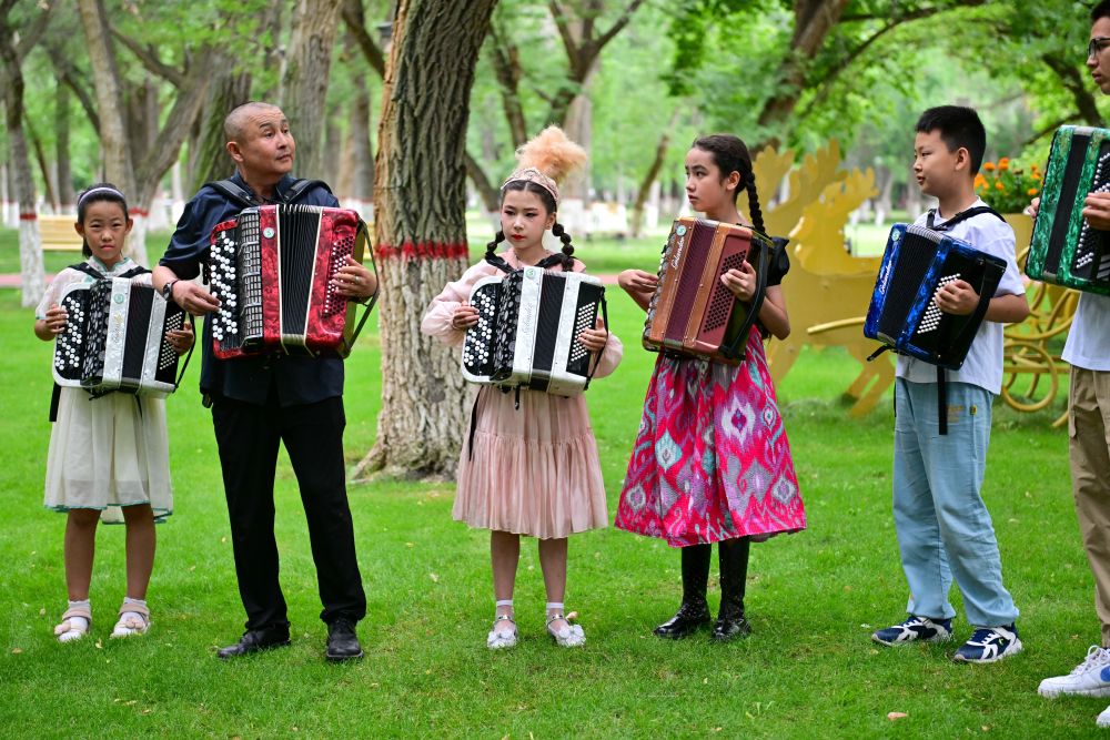 2024年7月24日,在新疆塔城市文化廣場,手風(fēng)琴文化傳承中心老師道吾然·對山漢(左二)帶領(lǐng)學(xué)生練習(xí)手風(fēng)琴。塔城市居住著漢族、哈薩克族、回族、維吾爾族、蒙古族、塔塔爾族、俄羅斯族等20多個民族,是一片多元文化沃土。手風(fēng)琴是塔城市民間最廣為流傳的樂器,也是各族人民文化交流的重要媒介。近年來,塔城市深入挖掘手風(fēng)琴文化,舉辦多場手風(fēng)琴文化藝術(shù)節(jié)活動,為各民族文化交流提供平臺。