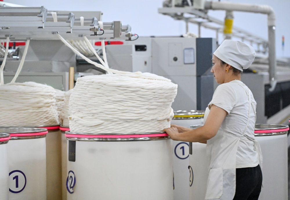 2024年7月4日,新疆克孜勒蘇柯爾克孜自治州一家紡織企業(yè)的工人在紡紗車間工作。棉花和紡織服裝產(chǎn)業(yè)已成為新疆重要的民生產(chǎn)業(yè)和支柱產(chǎn)業(yè)。近年來,克孜勒蘇柯爾克孜自治州阿圖什市以棉紡織業(yè)為引領(lǐng),積極招商引資,打造集紡紗、織布以及高端紡織品研發(fā)為一體的大型紡織產(chǎn)業(yè)園區(qū),為周邊鄉(xiāng)鎮(zhèn)群眾提供1500余個就業(yè)崗位。
