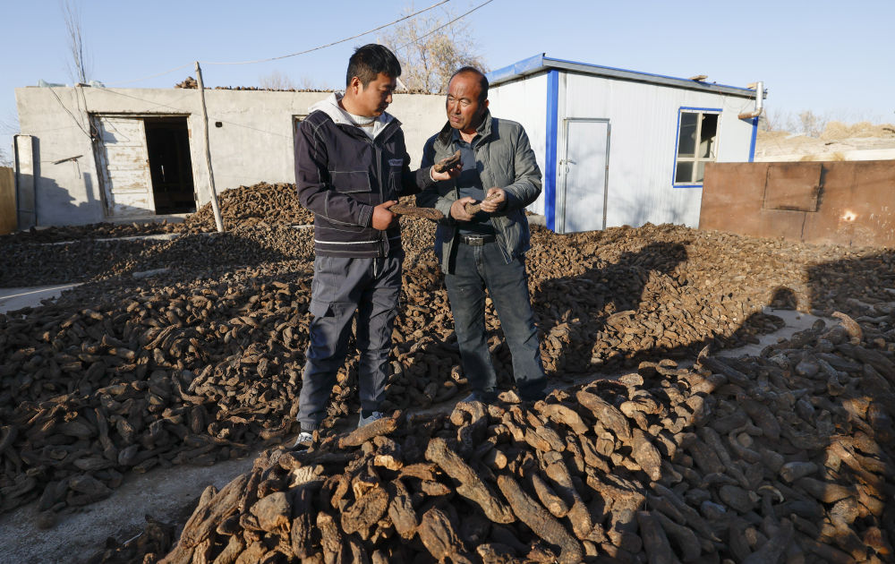 2024年12月4日,新疆民豐縣尼雅鎮(zhèn)甫甫克村村民麥麥提(右)同前來收購大蕓的商戶交流。自20世紀(jì)末新疆全面開展防風(fēng)治沙工程并大力推進沙產(chǎn)業(yè)以來,麥麥提從在合作社挖大蕓賺工錢,到后來主動學(xué)習(xí)大蕓種植技術(shù)并創(chuàng)業(yè),一路走來小有收獲。2018年,他承包了10畝沙地種紅柳、大蕓。紅柳茁壯成長,大蕓產(chǎn)量頗豐,麥麥提年收入超過5萬元。