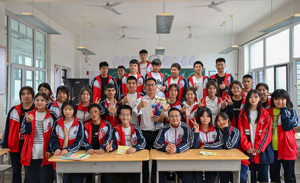 2024年9月10日,在新疆阿拉爾職業(yè)技術(shù)學(xué)校,援疆教師李斌傲(中)和23級電商班的學(xué)生合影。“95后”年輕教師李斌傲是第十一批浙江臺州到新疆阿拉爾職業(yè)技術(shù)學(xué)校援疆教師中的一員,負責(zé)教授電子商務(wù)專業(yè)課程。他在學(xué)校主導(dǎo)籌建了電商實訓(xùn)室,還帶了4個新入職的教師當(dāng)徒弟。“培訓(xùn)好本地教師,就是打造一支帶不走的隊伍。”李斌傲說。