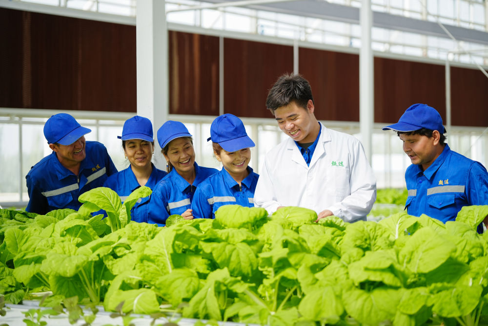 2025年6月25日,在新疆阿克蘇地區(qū)庫車市甬庫同心村智慧農(nóng)業(yè)植物工廠,技術(shù)人員在培訓(xùn)當(dāng)?shù)氐霓r(nóng)業(yè)產(chǎn)業(yè)工人。該工廠是浙江省寧波市對口援疆項目之一,引入了寧波企業(yè)先進的無土栽培技術(shù)和設(shè)備,通過智能調(diào)控成功種植多種原本不適宜在當(dāng)?shù)厣娴霓r(nóng)作物。該項目在幫助村民在家門口實現(xiàn)就業(yè)的同時,還為當(dāng)?shù)嘏囵B(yǎng)了農(nóng)業(yè)產(chǎn)業(yè)工人,同時為周邊學(xué)校開展農(nóng)業(yè)科技科普提供了便利,實現(xiàn)經(jīng)濟效益與社會效益“雙豐收”。