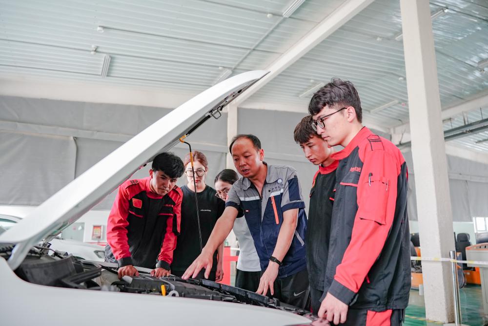 2025年6月27日,在新疆和田技師學(xué)院,援疆教師李寶(中)和當(dāng)?shù)亟處熞煌笇?dǎo)學(xué)生維修汽車。該校是北京市對口援疆幫扶單位之一,2020年以來,北京市向該校派出3批次累計30人次的援疆教師隊伍,他們在參與學(xué)校管理、承擔(dān)教學(xué)任務(wù)的基礎(chǔ)上,還主動開展“傳幫帶”培養(yǎng)當(dāng)?shù)亟處?,積極組織和指導(dǎo)學(xué)生參與各類技能競賽,為當(dāng)?shù)芈殬I(yè)技術(shù)教育高質(zhì)量發(fā)展貢獻力量。