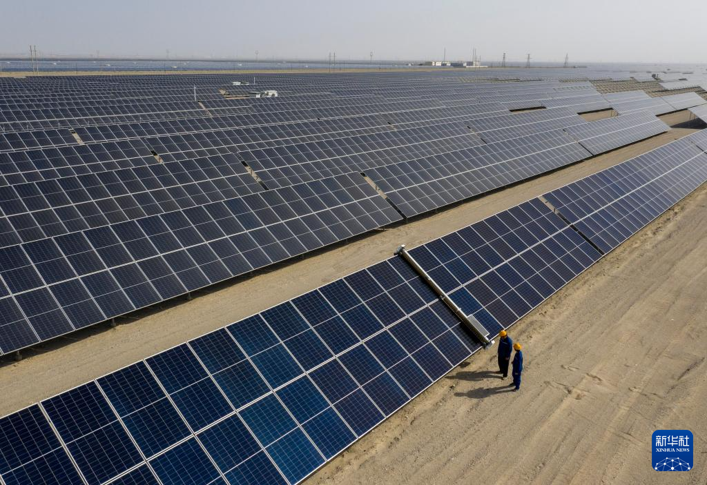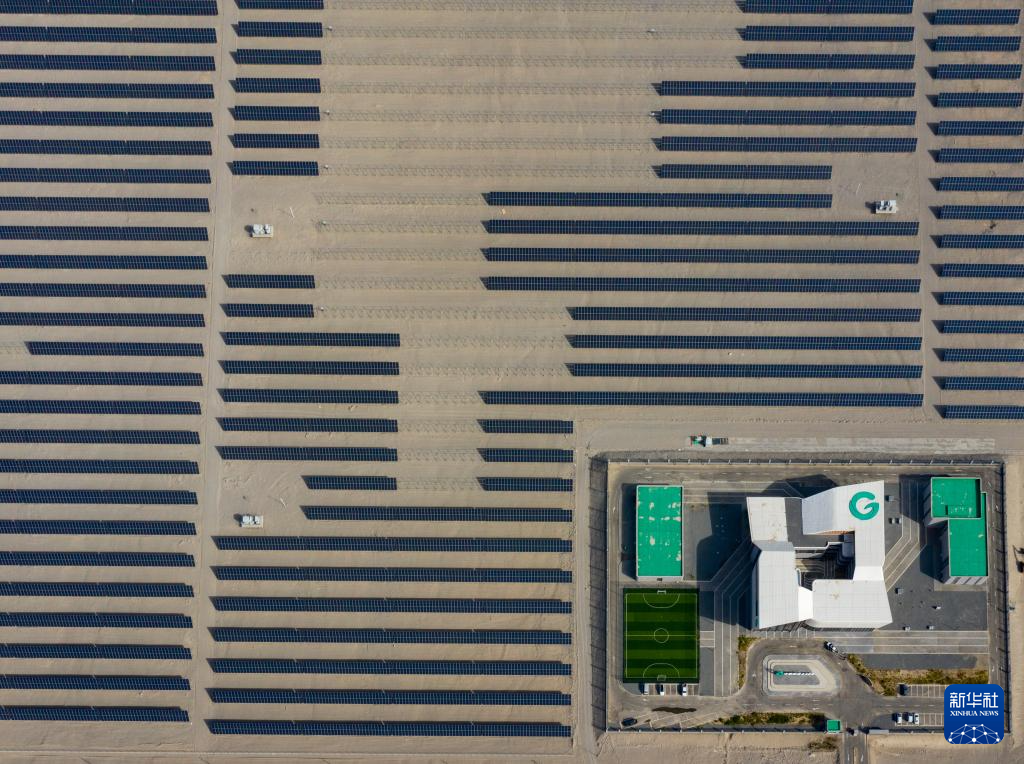 9月22日在新疆巴音郭楞蒙古自治州若羌縣拍攝的中國綠發(fā)新疆中綠電若羌400萬千瓦光伏項(xiàng)目(無人機(jī)照片)。該項(xiàng)目每年可發(fā)電69.08億千瓦時(shí),滿足南疆200萬戶家庭用電需求。
