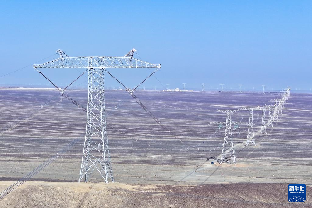 在新疆昌吉回族自治州木壘哈薩克自治縣拍攝的±1100千伏昌吉-古泉特高壓直流輸電線路(7月5日攝)。