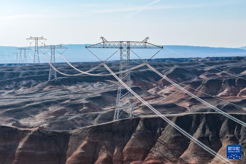 矗立在戈壁上的±800千伏哈密—重慶特高壓直流輸電線路工程(4月8日攝,無人機(jī)照片)。
