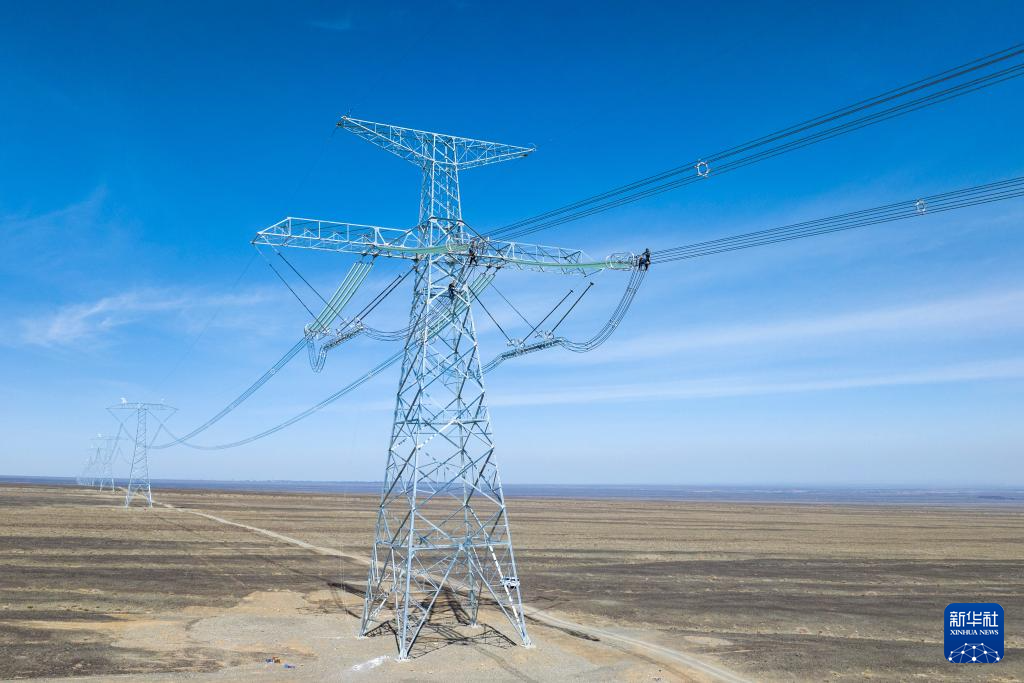 在新疆阿勒泰地區(qū)吉木乃縣拍攝的50萬千瓦時(shí)風(fēng)電項(xiàng)目配套輸電線路建設(shè)現(xiàn)場(7月1日攝,無人機(jī)照片)。