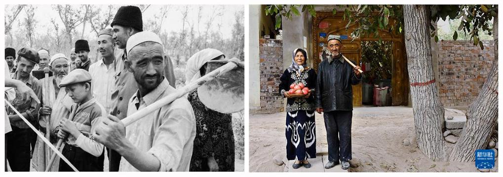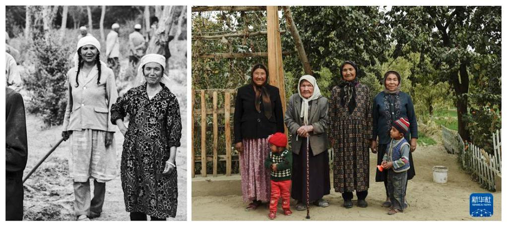 左圖:1990年9月,策勒鄉(xiāng)托帕村的農(nóng)民艾尼巴爾汗(中)和鄉(xiāng)親們一起在風沙前沿參加防風治沙勞動,身后的農(nóng)田和果林,是她們艱辛付出收獲的成果;右圖:2016年10月,艾尼巴爾汗(左四)和鄉(xiāng)親們在林地前合影。