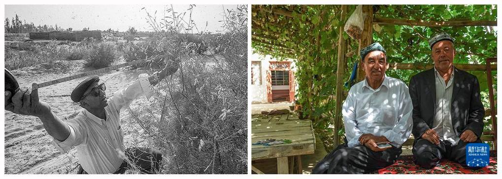 左圖:1995年,阿不都在丈量沙漠前沿紅柳生長情況;右圖:2016年,退休后的阿不都(左)在綠樹環(huán)抱的庭院里。時任策勒縣林業(yè)局局長阿不都·熱合曼感慨萬千:“在風沙面前,策勒人已三度退讓,而風沙還在步步緊逼。后面是昆侖山,我們已再無退路;只有奮起向風沙宣戰(zhàn)。多年過去,我們終于在不斷進逼的黃沙面前站穩(wěn)了腳跟。”