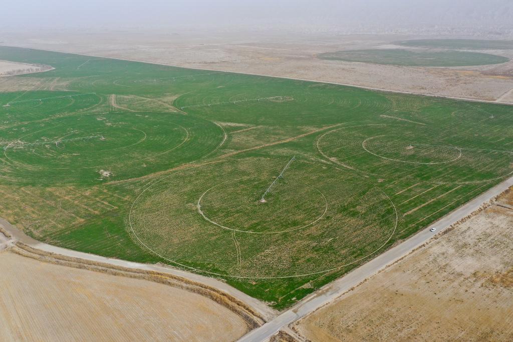 在新疆阿克蘇地區(qū)拜城縣塔里木河干流生態(tài)綜合治理項目區(qū)拍攝的萬畝人工草場(2025年4月12日攝)。新華社記者 丁磊 攝