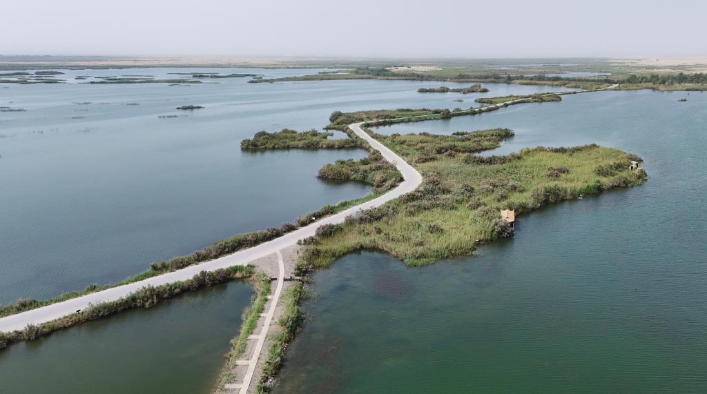 這是2025年8月6日拍攝的拉里昆國家濕地公園。近年來,新疆通過退耕還濕、生態(tài)補水、修建沙漠緩沖帶等系列修復(fù)措施,濕地保護成效顯著。新華社記者 周佳誼 攝
