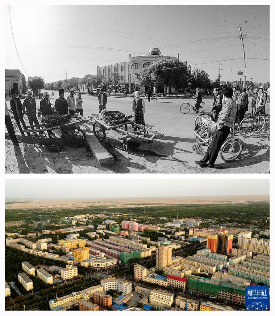 上圖:1990年拍攝的策勒縣城,下圖:2016年拍攝的策勒縣城。