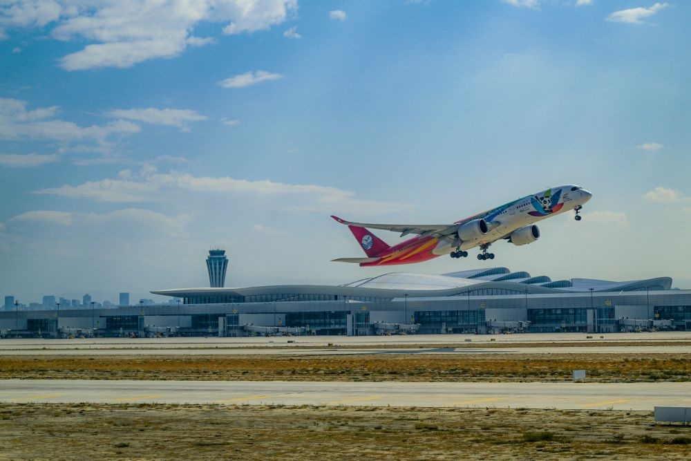 飛機(jī)沿著跑道滑行,飛向萬里碧空。送別的人群,沉浸在幸福的喜悅中,久久不愿離去。