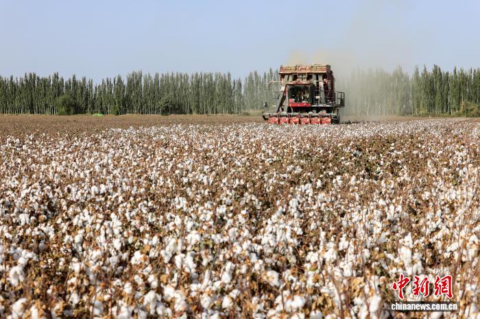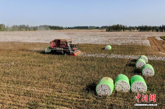 9月28日,新疆阿克蘇地區(qū)阿瓦提縣塔木托格拉克鎮(zhèn)托萬克塔木托格拉村種植的長絨棉進入采收季,采棉機在田地里采收并打包。中新社記者 張宇 攝